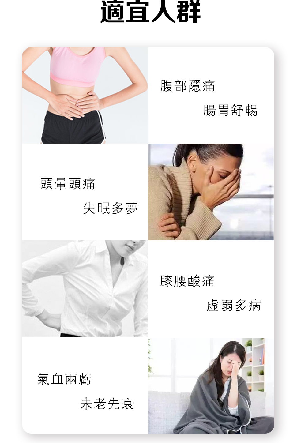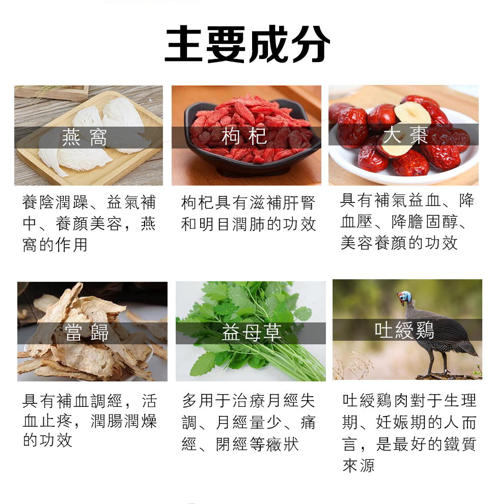 容颜憔悴、补血养颜、暗疮口臭、腹部隐痛、肠胃舒畅、头晕头痛、清洁止带、气血两亏失眠多梦、产后恶露、未老先衰、腰膝酸痛、虚弱多病。