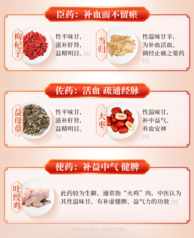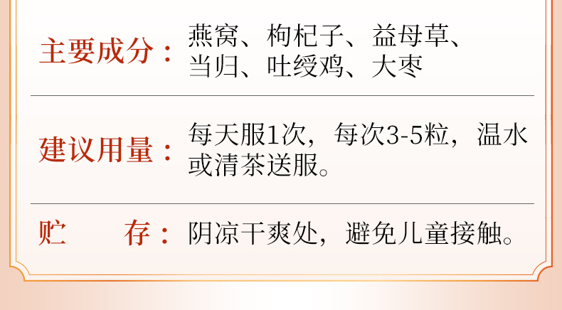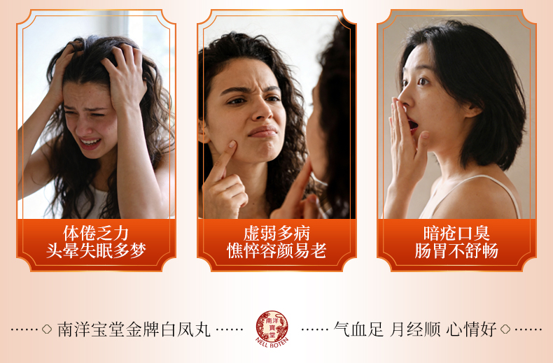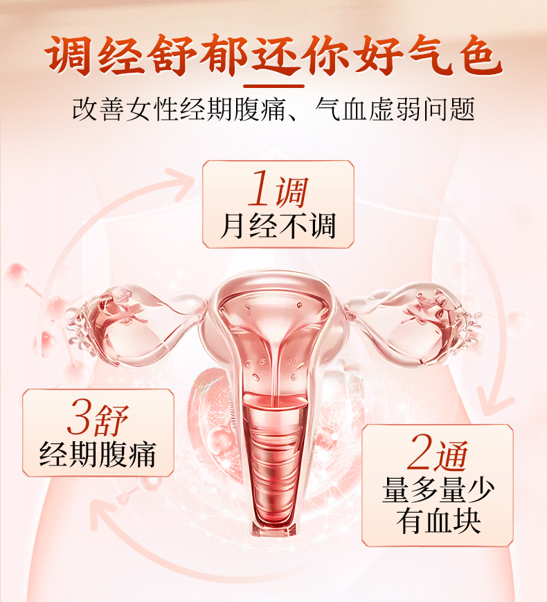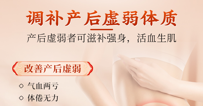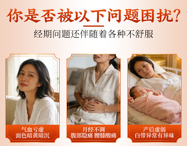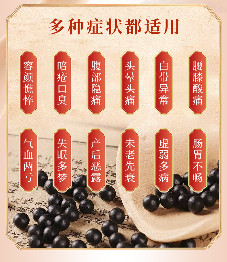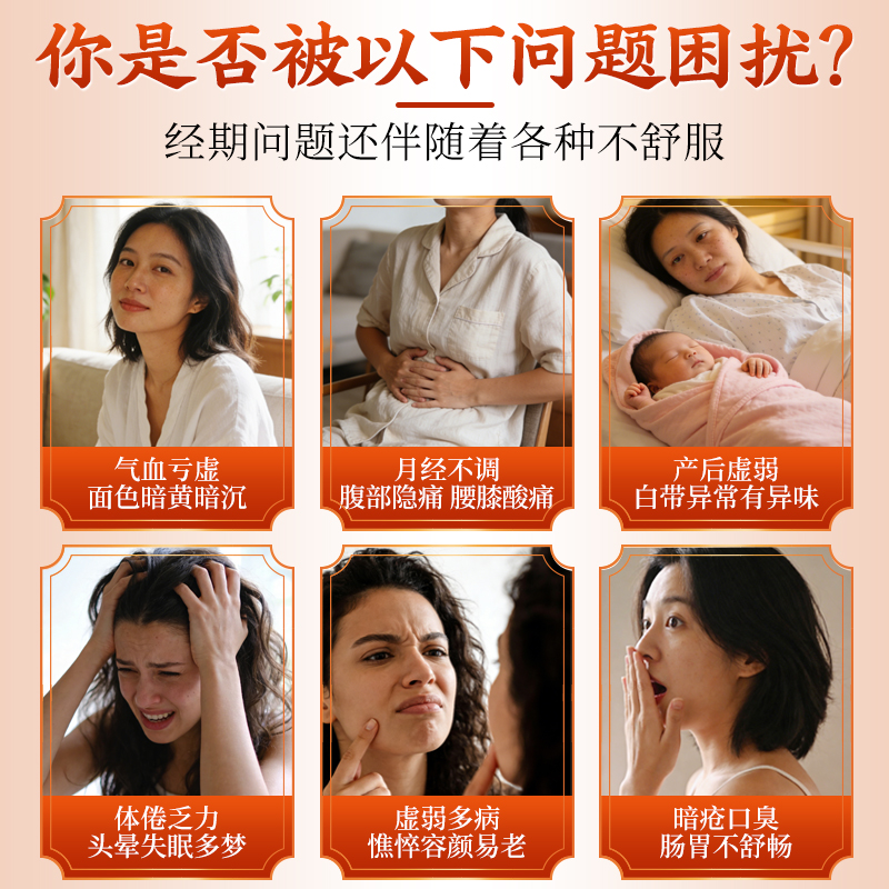 容颜憔悴、补血养颜、暗疮口臭、腹部隐痛、肠胃舒畅、头晕头痛、清洁止带、气血两亏失眠多梦、产后恶露、未老先衰、腰膝酸痛、虚弱多病。